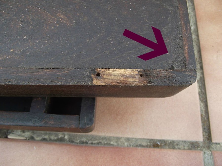 Como siempre empecé quitando los herrajes, aunque sólo pude quitar las bisagras porque tanto el asa como el cierre estaban fijados con unos remaches muy fuertes y me dio miedo dañar la madera al quitarlos. Al quitar las bisagras, y en la parte interior de los compartimentos de la tapa, se veía el color original de la madera antes de haberle dado el tinte oscuro que tenía.