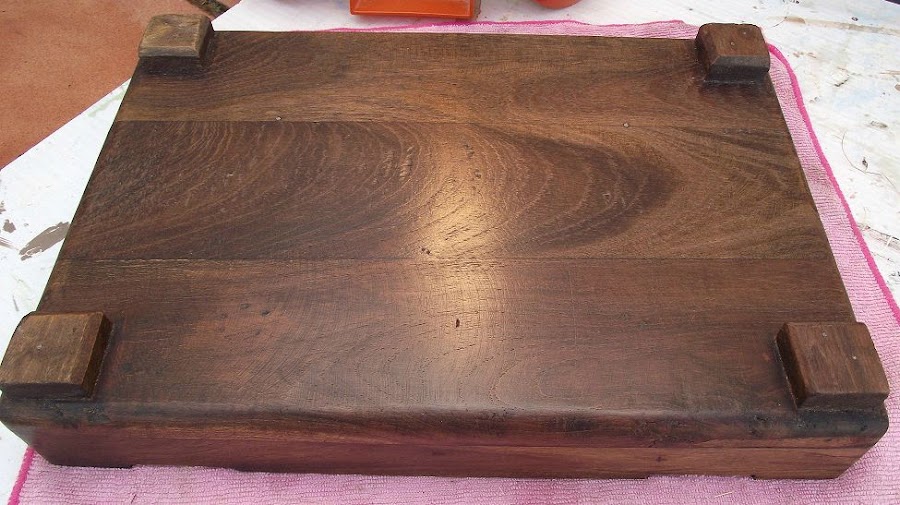 Después apliqué una mano generosa de cera Chopo incolora con brocha, para que penetrase bien en la madera, que había quedado muy reseca. Por último, y utilizando lana de acero fina, estopa y calcetín de lana (en ese orden) bruñí la cera con energía y paciencia, un trabajo que es muy agradable porque se va viendo cómo la madera adquiere el brillo satinado de la cera y un aspecto hidratado y cuidado. Hice estas dos fotografías para mostraros lo que digo de la cera. En la primera sólo está terminada la mitad de la base y se aprecia perfectamente hasta dónde se ha llegado.