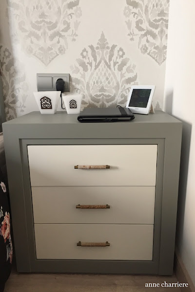 Para estos tipos de muebles, con líneas rectas, no procedía envejecerlos sino más bien darles un efecto liso para aportar contraste con el papel estampado del paño de la pared.