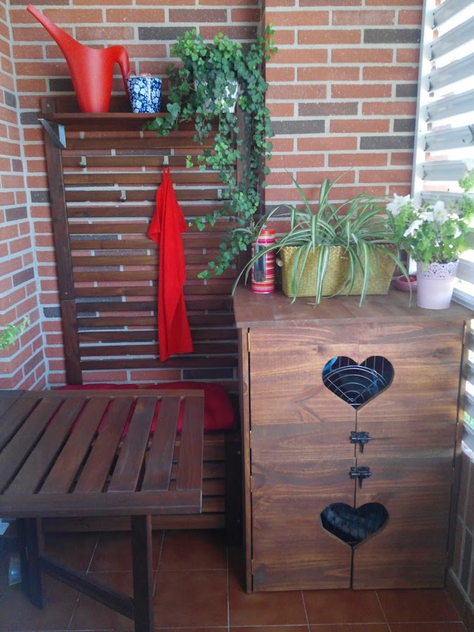 Tan grande lo hice, que cuando fui a colocarlo en mi terraza ¡no me entraba por un centímetro! Pero el problema era que la Jaula ya entraba bastante justa, así que tuve que reducirlo lo máximo que pude, y cortar la base, de manera que me quedara apoyado encima del rodapie. Vamos a medida 100%.