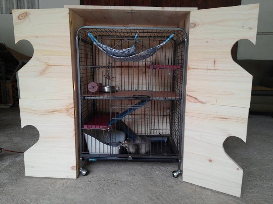 Después de mucho pensarlo decidí que el mejor sitio era la terraza, pero me daba miedo que pasara frío, así que aprovechando que los hurones tienen que tener muchas horas de oscuridad (para poder cumplir con su fotoperiodo), decidí construir un armario lo suficientemente grande como para que entrara su jaula.