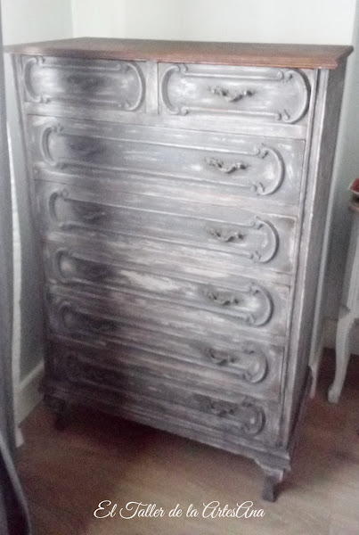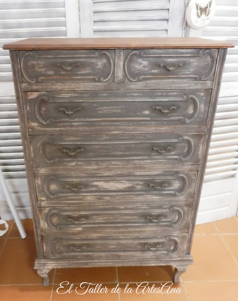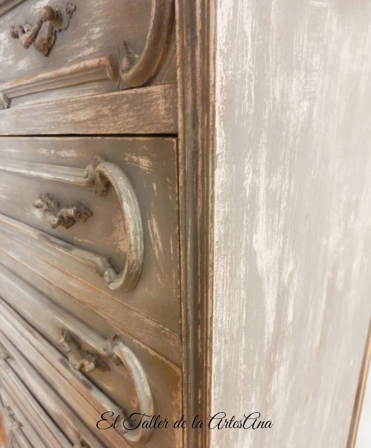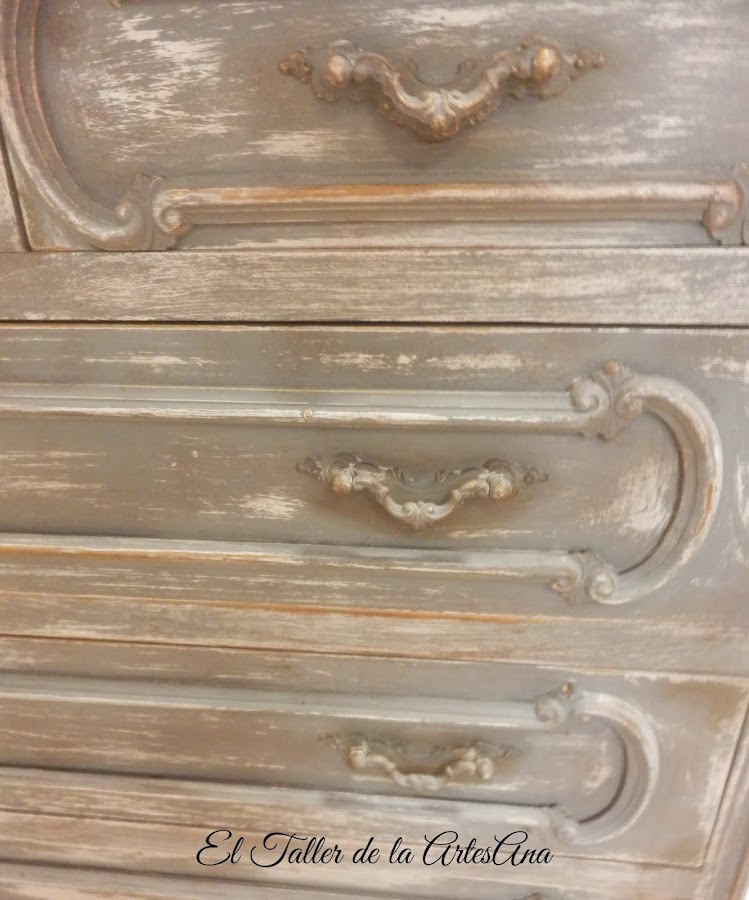 Quería que la transformara en un mueble de estilo Shabby Chic muy especial, que llamara la atención, y es que a Carlota le gustan mucho los muebles muy decapados y con aspecto de tener muchos años encima. El color principal era el gris pero para conseguir estos efectos hay que trabajarlo con otros colores y muchas pátinas. Y así quedó, atrevido no?