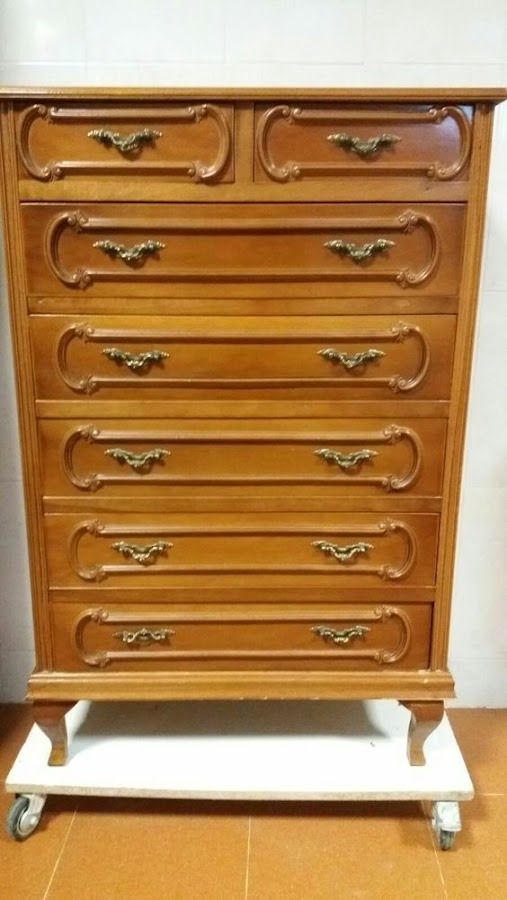 Hoy os quiero enseñar un trabajo a pedido que me encargó Carlota, una clienta que ya ha repetido en varias ocasiones conmigo para transformar los muebles que tenía en casa y que como estaban en buen estado prefería cambiar su aspecto antes de comprar otros nuevos. Ella tenía una cómoda muy normal. Estos muebles no tienen gran valor ni estético ni de calidad ya que suelen ser de aglomerado con chapas de madera por eso no importa si los decoramos. Yo también estoy de acuerdo en que los muebles de calidad y de maderas nobles se deben restaurar y no decorar pero este no era el caso. Os enseño como era antes. Así es que manos a la obra!!!