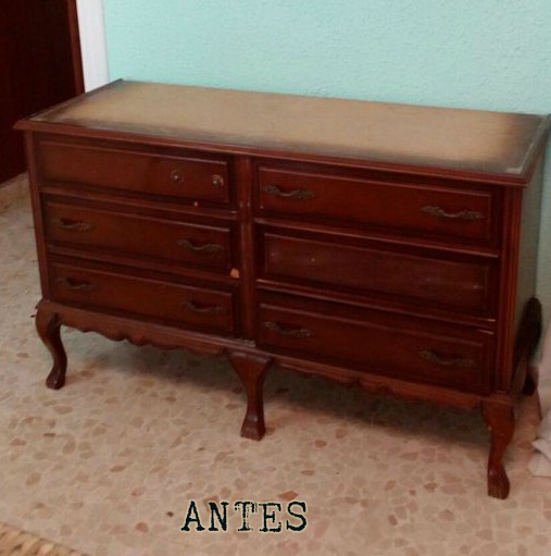 Hoy os quiero enseñar uno de los últimos trabajos que he hecho para mi tienda. Se trata de una cómoda de seis cajones. Era la típica cómoda de los años 80 de un color oscuro y mucho brillo.