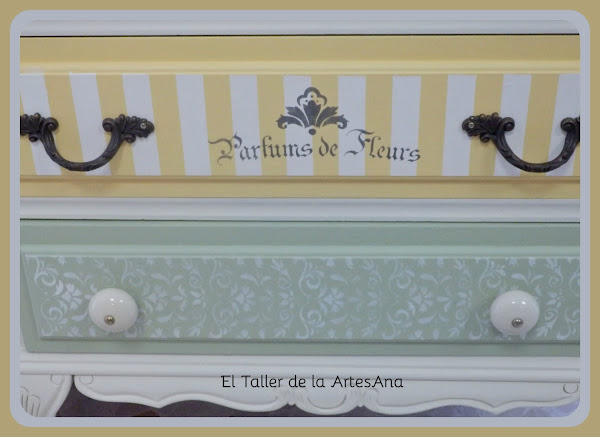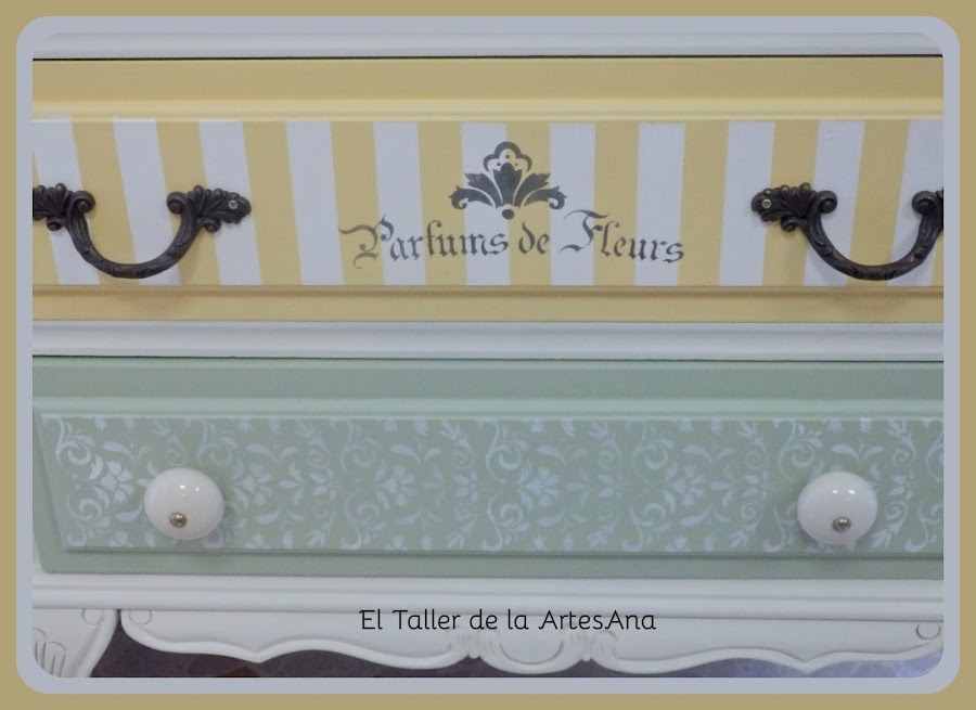 En estos cajones utilicé la técnica del stencil con unas bonitas plantillas. Las rayas las hice con cinta de carrocero.