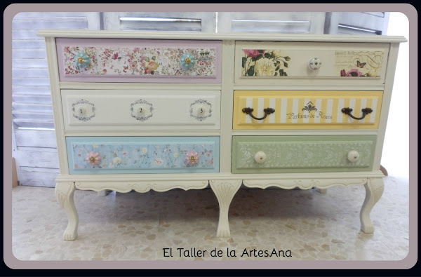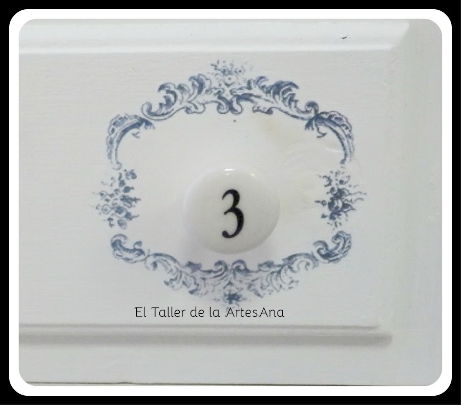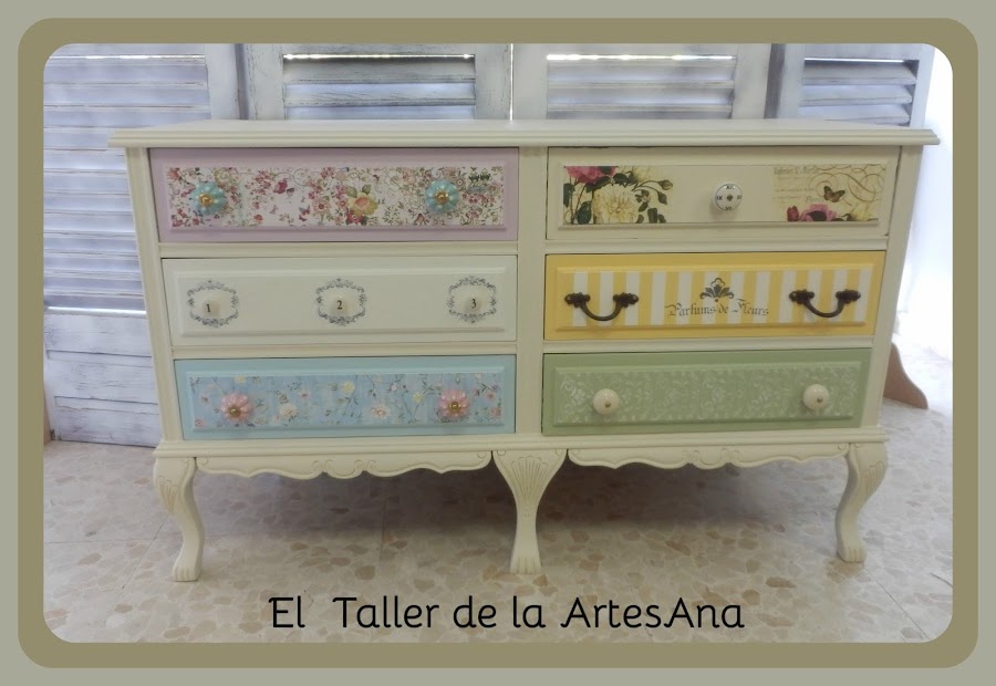 También utilizamos unos preciosos tiradores, distintos todos en cada cajón. Todo esto hace que sea una pieza única y muy original aparte de una auténtica dulzura.