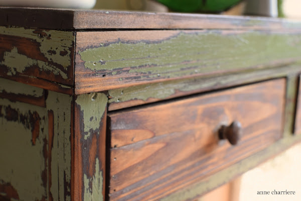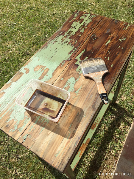Aquí en las fotos, podéis ver que una vez lijada y limpia, empiezo a aplicar el aceite de Tung. Se trata de un aceite que proviene del árbol chino de Tung. No tiene apenas olor, protege muchísimo y deja un acabado instantáneo de envejecido por su color tostado; una maravilla...