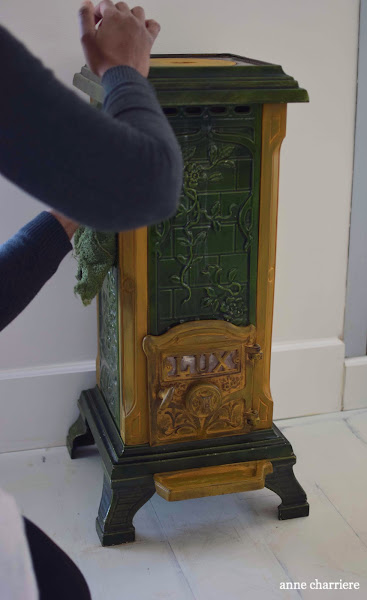 Bien, pues esta estufa, que también he visto toda la vida en el hall de mi casa, ha pasado por el aro de la pintura de leche y su aceite de cáñamo correspondiente.