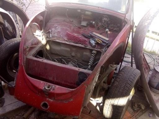 Fuimos a verlo, el precio estaba más o menos razonable, el pobre carrito estaba oxidado y con las sillas mal soldadas y reparaciones medio dudosas, pero parecía tener potencial. Fuimos con un par de amigos y entre ellos, Fer y el que vendía el vocho (como favor a una amiga) llegaron a la misma conclusión: estéticamente estaba vuelto nada, pero el motor parecía estar más o menos decente. Metía bien las velocidades y frenaba como lo haría cualquier carro del 94, un poco lento pero bien. No más míralo en su esplendor mal arreglado, cuando lo compramos y era un rojo-naranja mal hecho, por dentro el rojo cereza original.