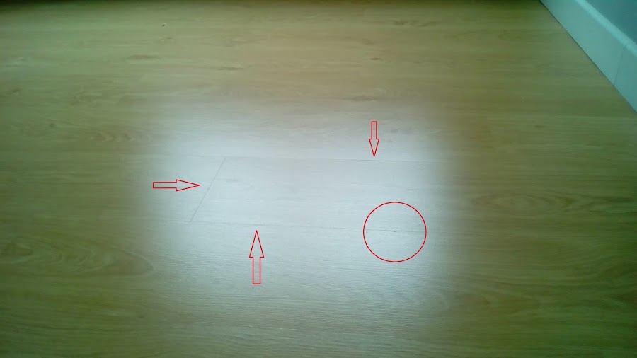 Esa mancha rectangular que se ve en la foto es un fallo en la impresión del dibujo. Solo se aprecia a contra luz, por lo que alguien que no esté acostumbrado a fijarse en este tipo de fallos podría dejar una o varias tablas defectuosas en el centro de un salón, dormitorio, pasillo...