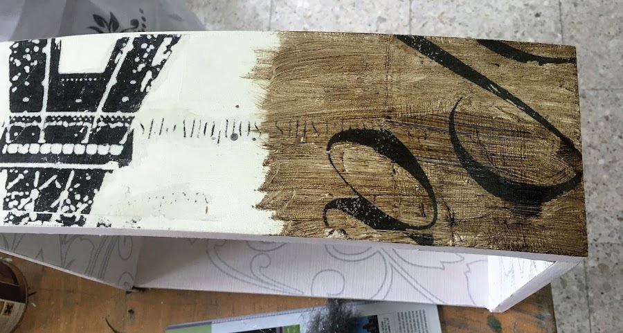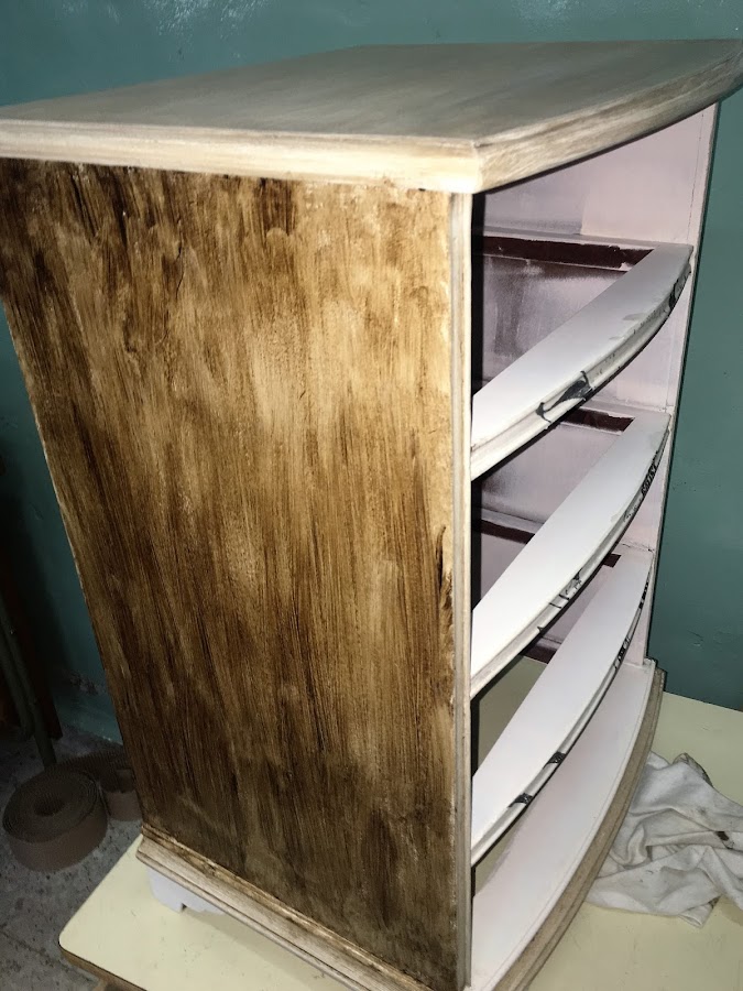 Este es el resultado de la imagen ya transferida en la mesilla, como el aspecto era demasiado blanquecino se procede a envejecer todo el conjunto.