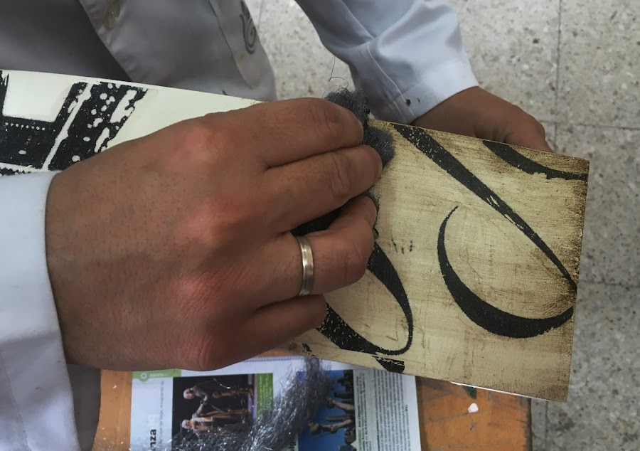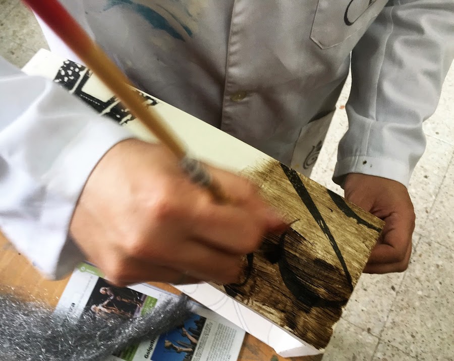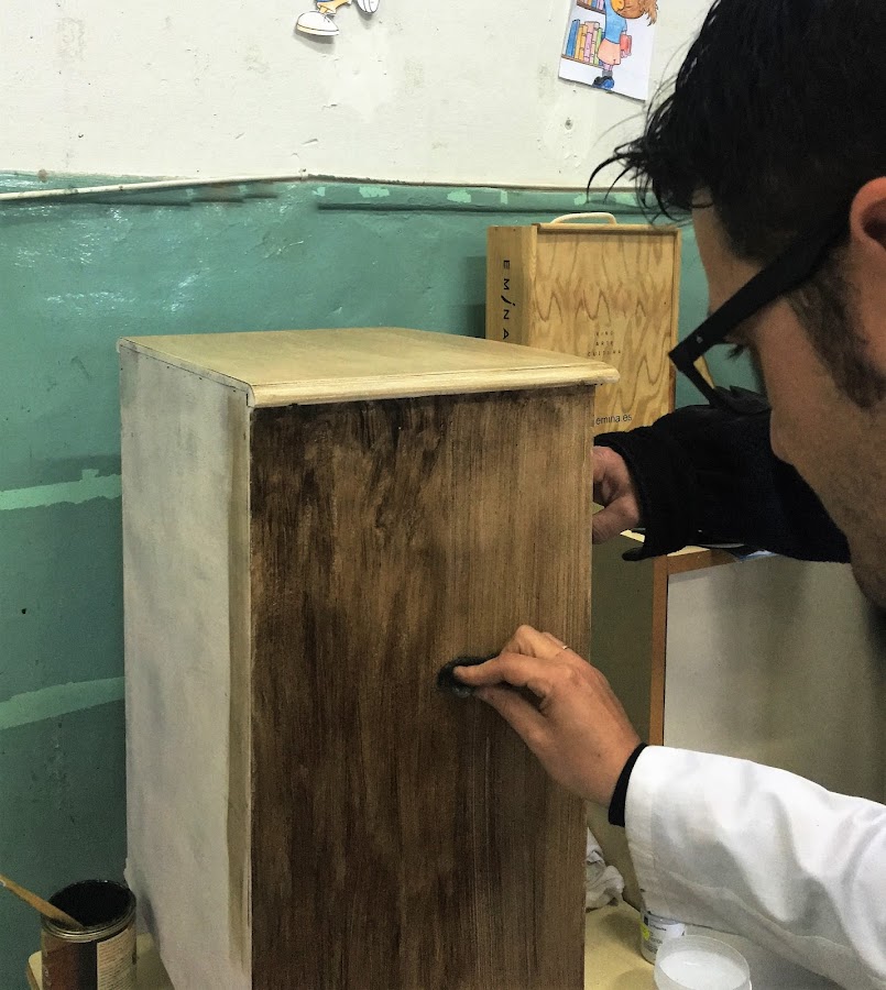 Para este paso se aplica una pátina de "betún de Judea" y cera, se aplica con una brocha y se retira con con una lana de acero grano 000 al gusto hasta darle un acabado envejecido.