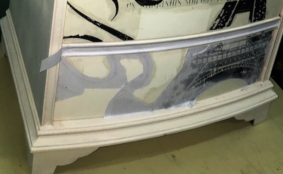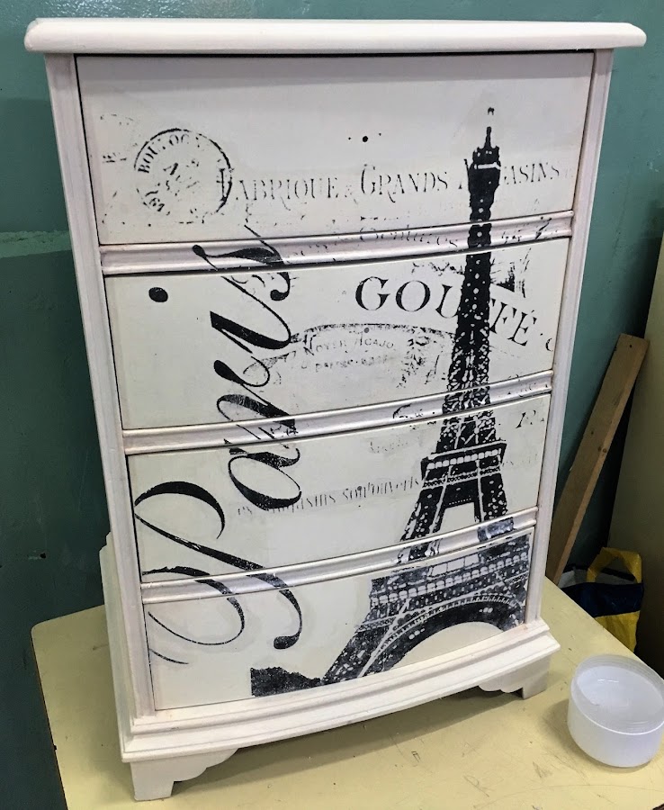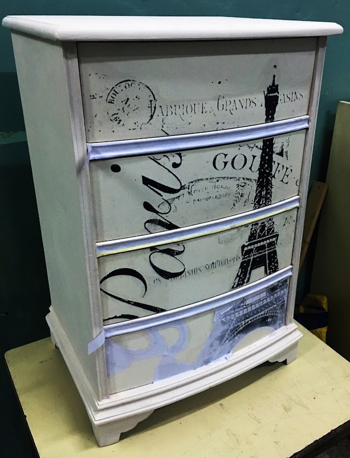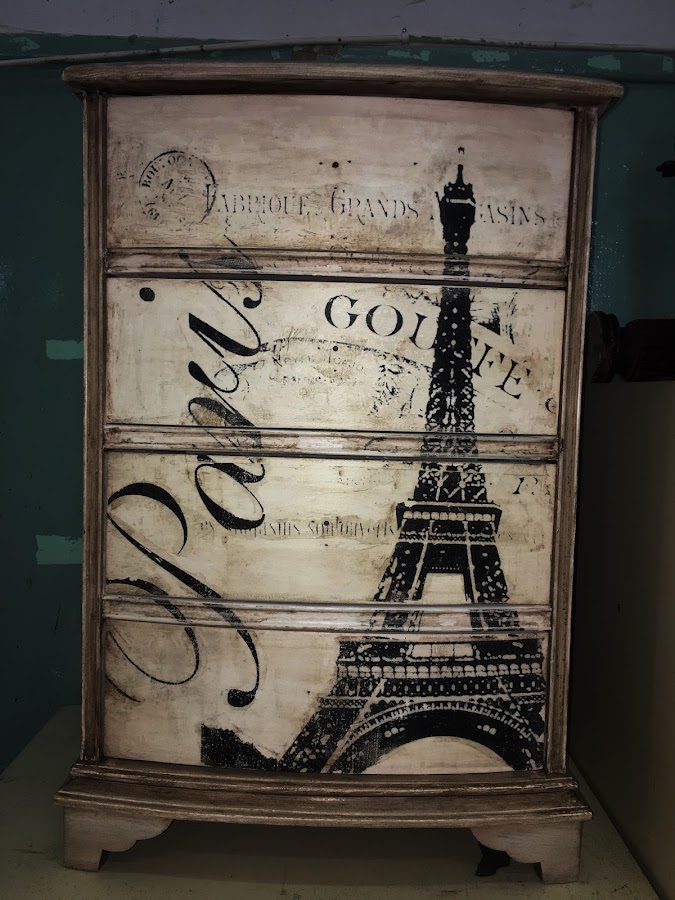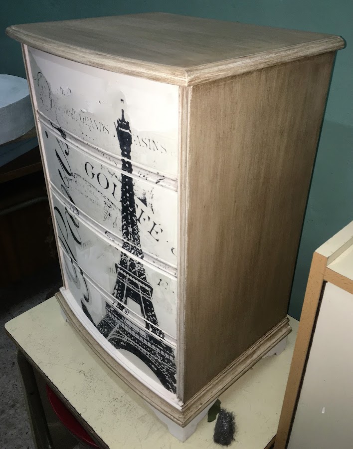El siguiente paso es elegir una imagen en blanco y negro para transferirla a la mesilla, la elegida es una vintage de la torre "Eiffel" y simplemente la hacemos una fotocopia efecto espejo del tamaño del frontal de los cajones.