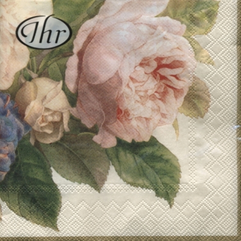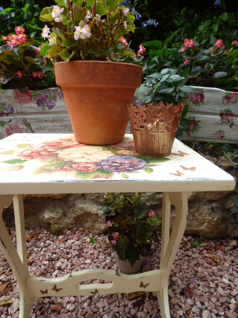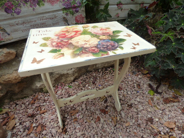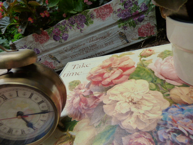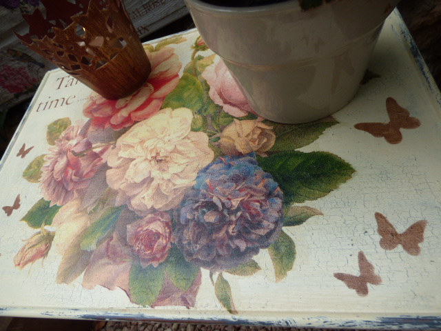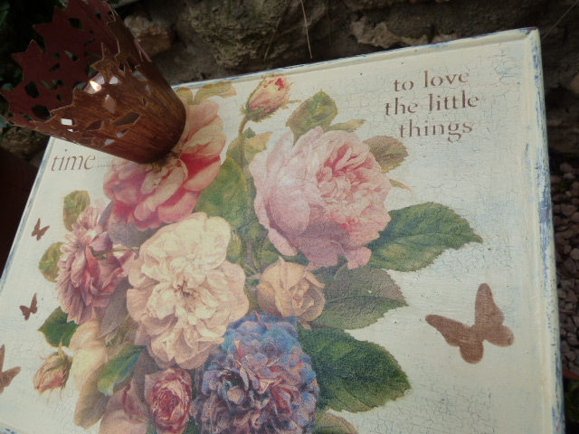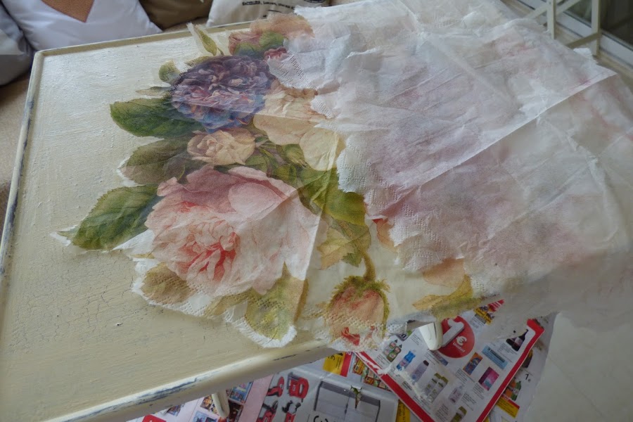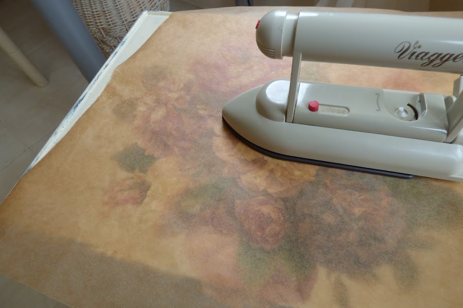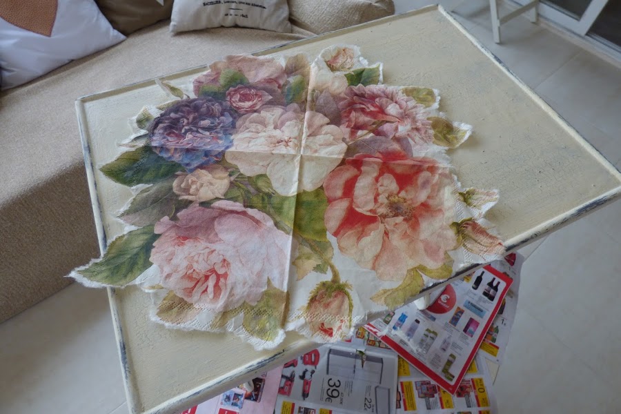 La servilleta que por fin he decidido usar tiene las flores haciendo un circulo y además casi del mismo tamaño que la mesita. Sólo le he quitado alguna hojita para que no se saliera del espacio