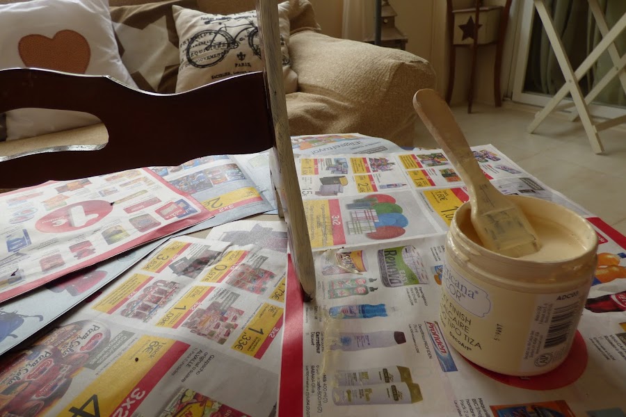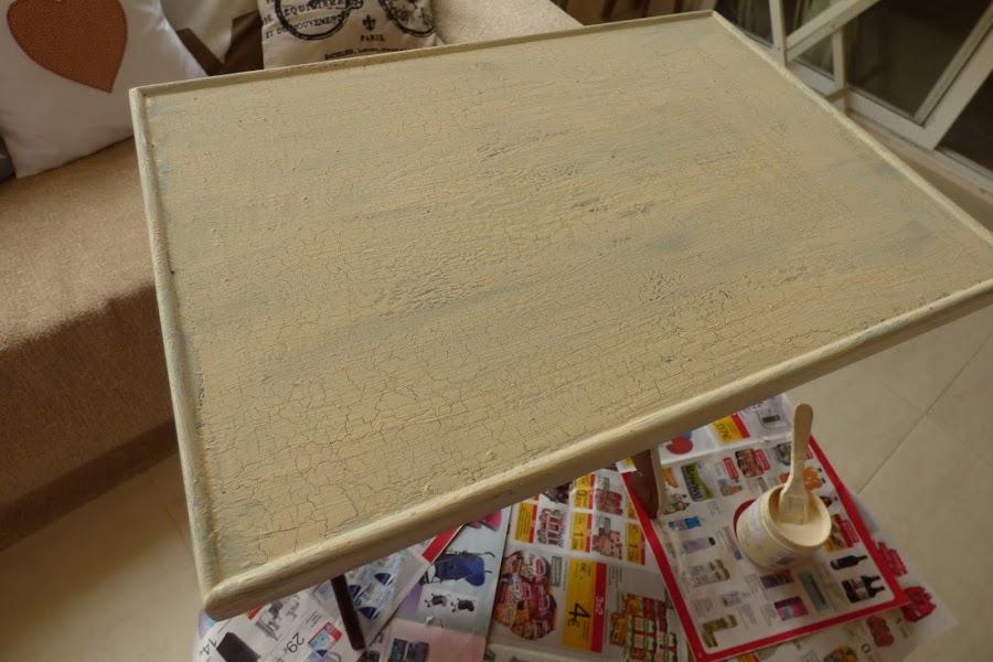 Una vez seca la pintura clara, he extendido cola de carpintero un poco disuelta en agua, en todo el sobre de la mesita y la he dejado secar