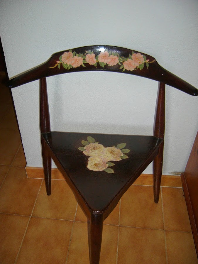 La limpié la barnicé y en el asiento pinté unas rosas , en el respaldo hice un decoupage, después una mano de barniz y lista.En las fotos no se aprecia muy bien las flores el asiento , no sé si por la luz o porque no tengo mucha maña con las fotos ,pero bueno lo principal es que le gusto mucho y la tiene en la entrada de su casa. Os dejo las fotos, gracias por las visitas y los comentarios que animan a continuar.
