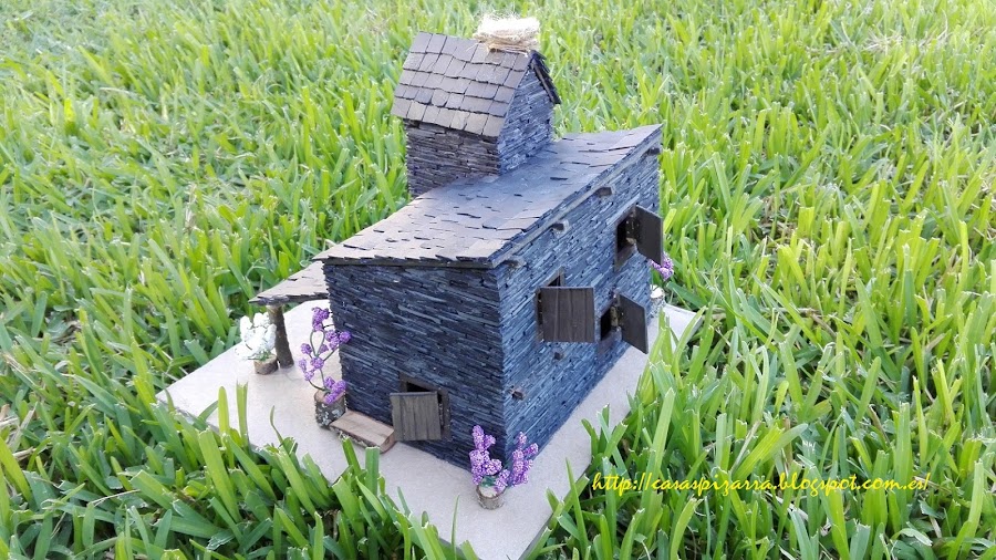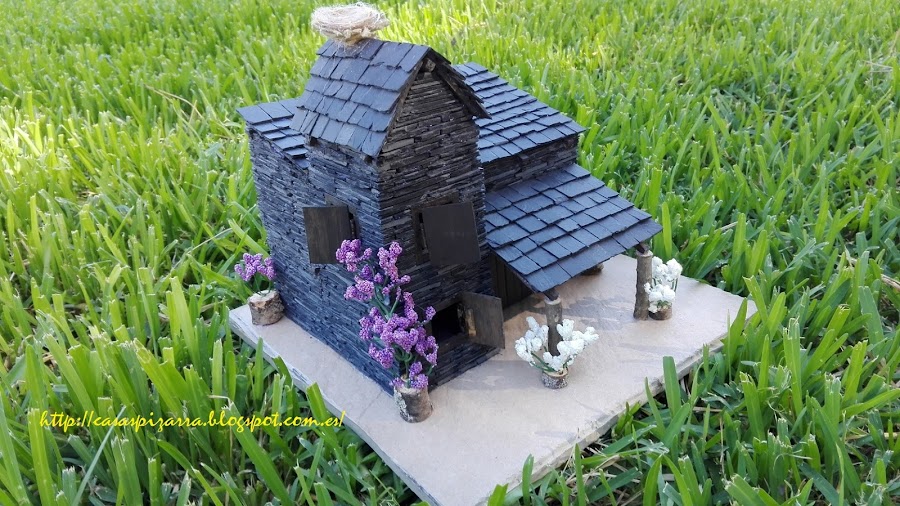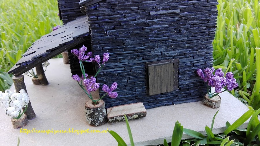 Como la casa va a ser un regalo de cumpleaños para una niña de alguna manera había que darle un poco de color, así que buscamos unas florecillas para adornar la casita, elegimos dos colores el malva que es un color que le gusta mucho y el blanco para que resalte sobre la fachada de pizarra negra.