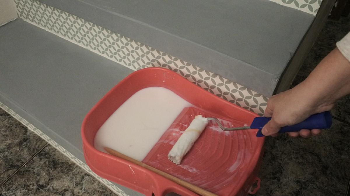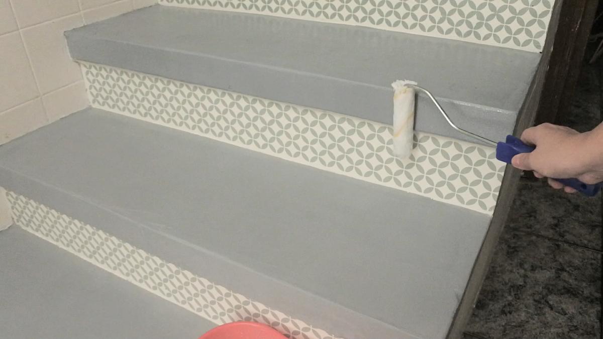 Dejamos secar este primer color (french mood) y seguimos por el frontal de los escalones. Como habéis visto en la foto inicial hemos creado un dibujo de mosaico por lo que primero pintamos la base, en este caso el color elegido fue chalk white. También nos hemos ayudado del rodillo para que la capa de pintura quede bien repartida y sea uniforme.