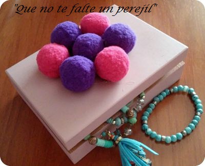 Pero una vez que empiezo ya no paro y viendo una cajita de madera pequeña que tenía en la habitación, también se la pinté con pintura a la tiza en spray rosa y la decoré con unos borlones. Ahora sirve para guardar sus pendientes.