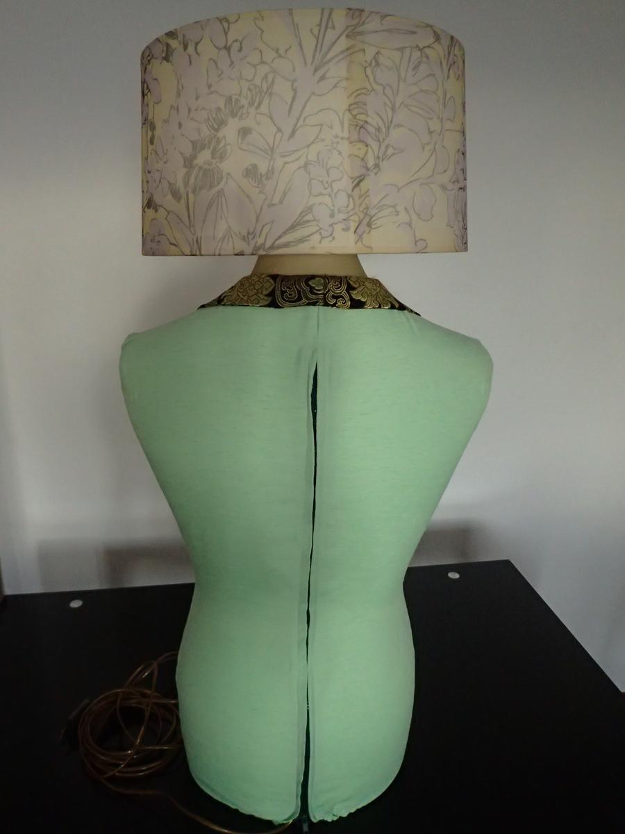 La tulipa podemos comprarla en cualquier centro de decoración como Leroy Merlin, habrá que escoger un tamaño adecuado para el maniquí y un color que nos combine con la tela. En este caso he comprado una blanca lisa para después pegar un tejido de tul estampado. Primero se corta un rectángulo de tela que cubra toda la tulipa y después se va pegando usando cola blanca.