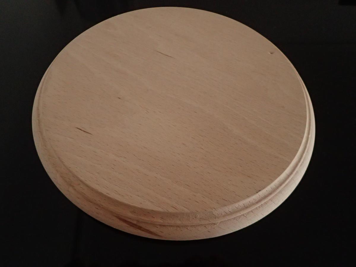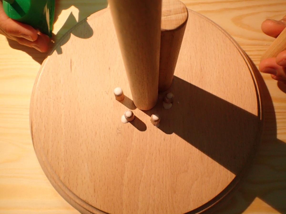 Cuando la cola del soporte ya esta seca podemos colocar la peana sobre el mueble, puedes utilizar tornillos que traspasen desde la parte interior de la superficie del mueble hasta la peana o clavijas de madera nuevamente. Nosotros nos hemos inclinado por esta opción, así que hemos hecho tres agujeros en la base de la peana que encajan con otros tres agujeros en la superficie del mueble pero esta vez no hemos usado cola para poder desmontarlo y trasladarlo fácilmente en caso de necesidad.