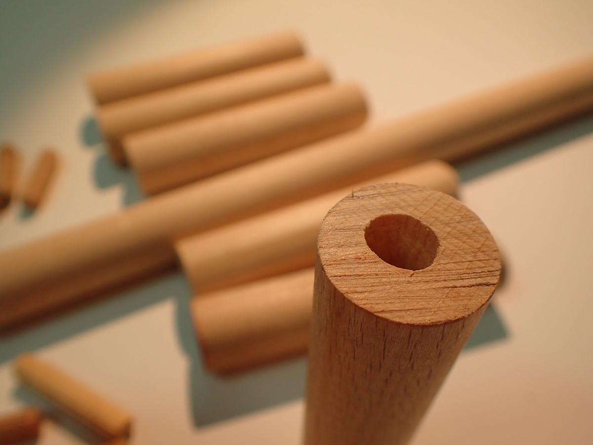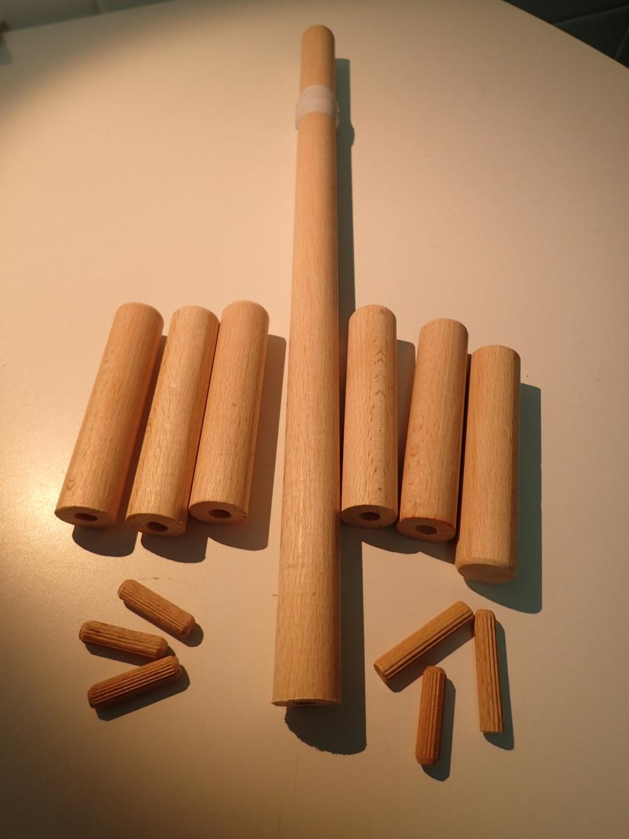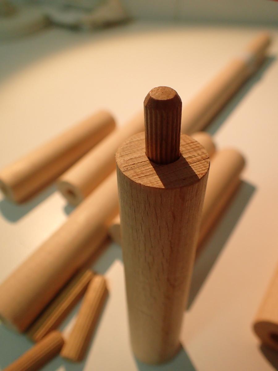 Con todas las piezas cortadas y los agujeros hechos procedemos a colocarlos, primero el palo central y más largo que ha de encajar en el agujero más grande de la peana, seguidamente iremos encolando e introduciendo las clavijas de madera en los otros agujeros y a continuación pondremos los palos más pequeños sobre ellas. Para darle mayor rigidez hemos encolado también unos palos con otros.