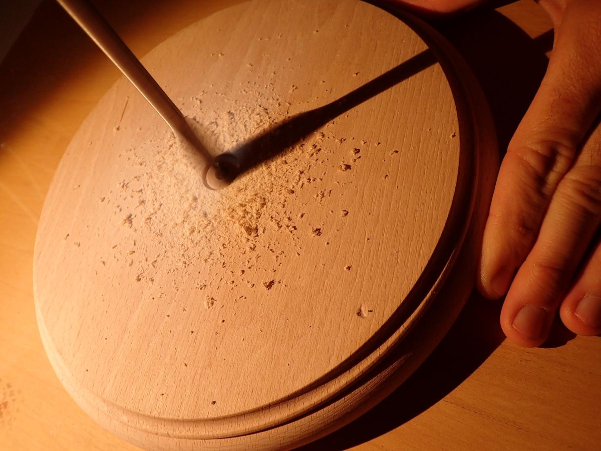 En la peana haremos un agujero central con una broca de pala (las hay de distintos grosores y lo ideal es que tenga la misma medida del diámetro del listón). Este agujero traspasa totalmente, por lo que el palo más largo de madera descansara sobre el mueble y no sobre la peana. Alrededor de este orificio central irán los agujeros para las clavijas de los palos más pequeños, sin llegar a traspasar la peana.