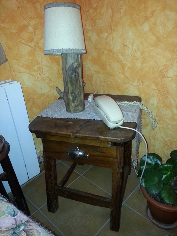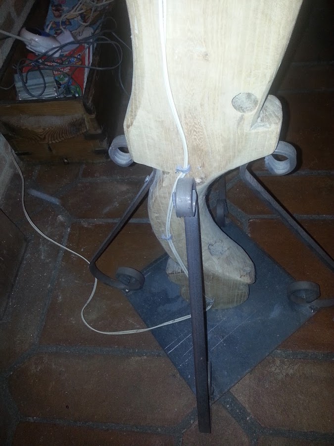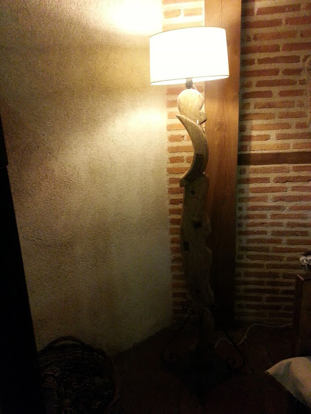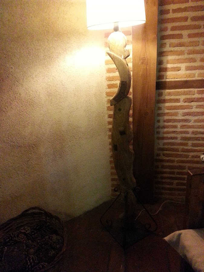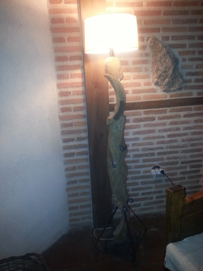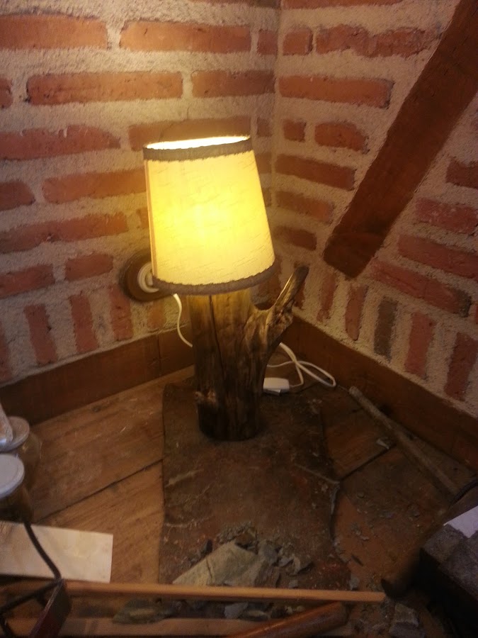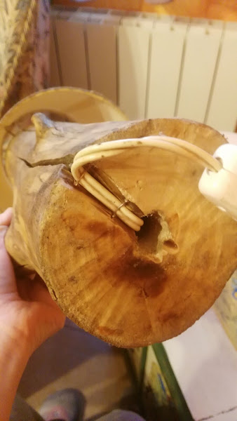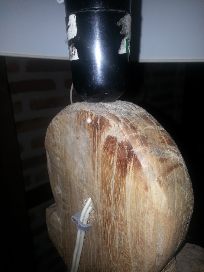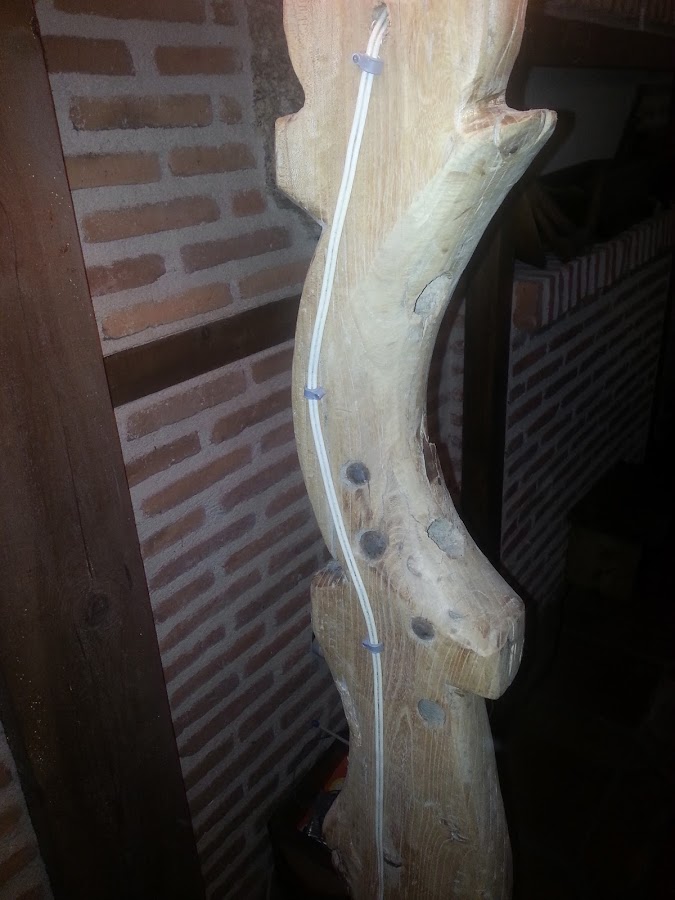 Esta otra lámpara, es un tronco que encontré en un paseo por el rio. No tengo fotos del proceso, pero al tronco le corto a la medida que quiero y taladro el interior, quedando un orificio de un lado al otro, por el que pasa el cable.