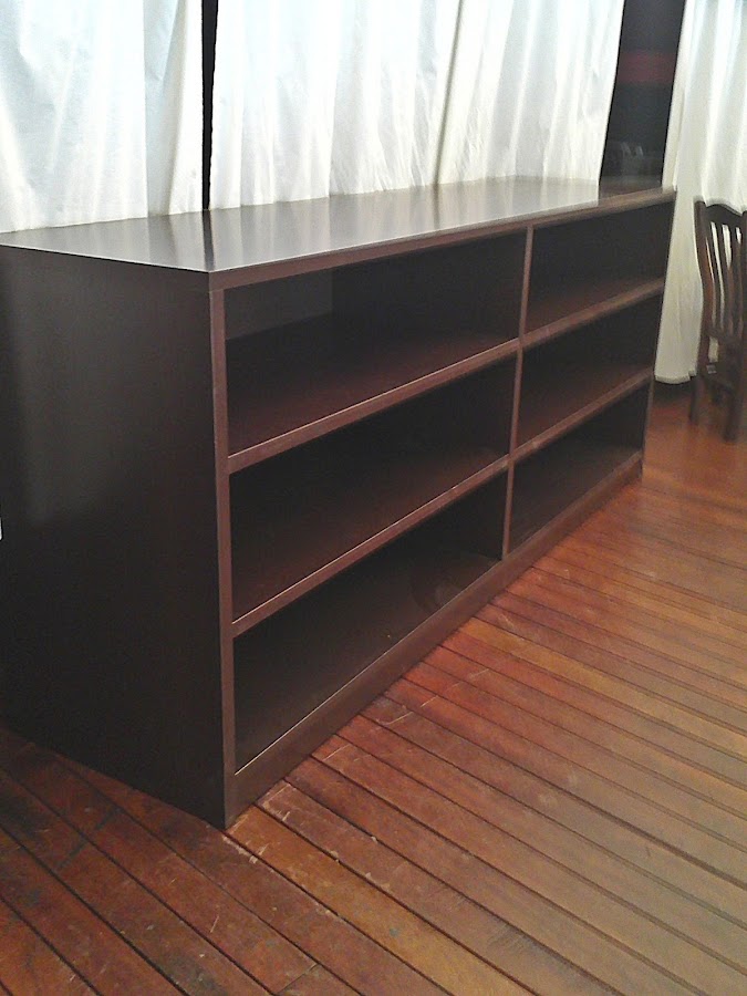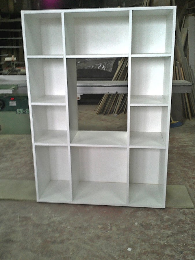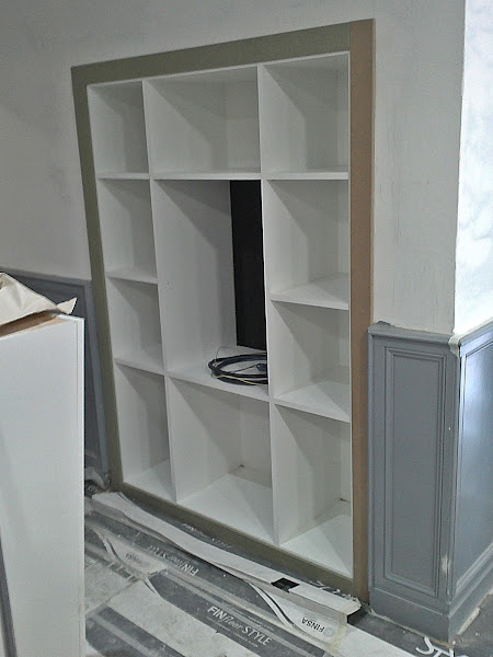 Hicimos una estantería empotrada, de tablero de partículas con chapa de melanina con un hueco en medio a medida para un mini bar.