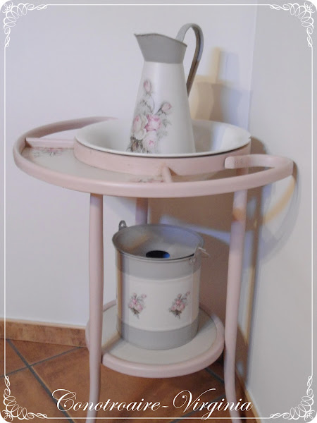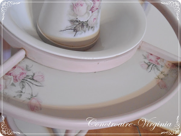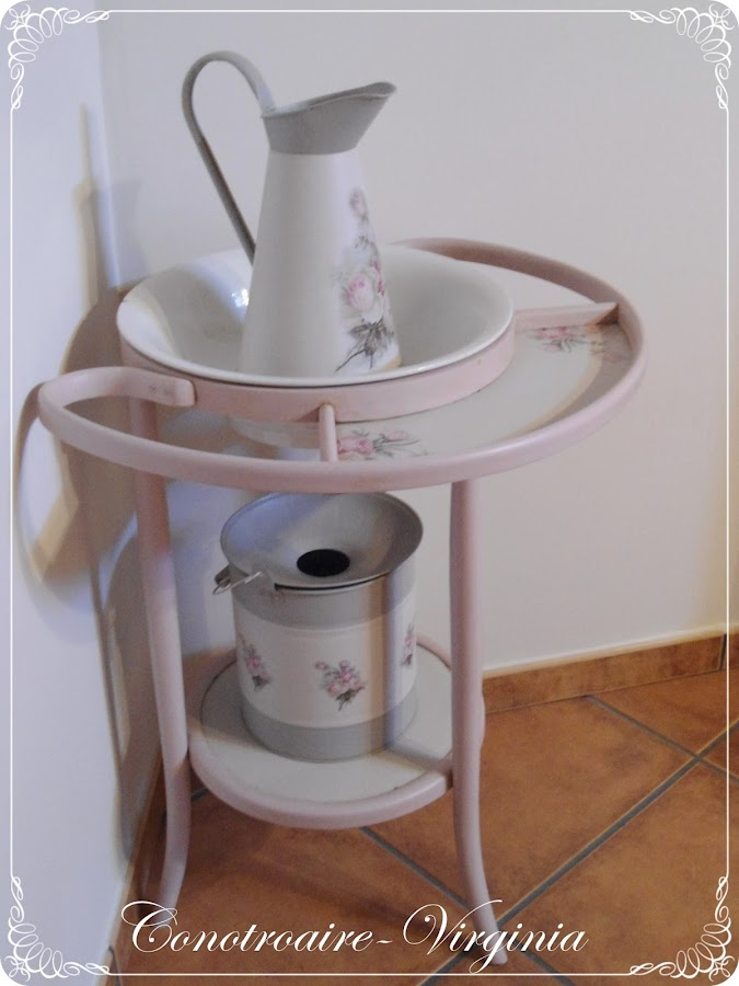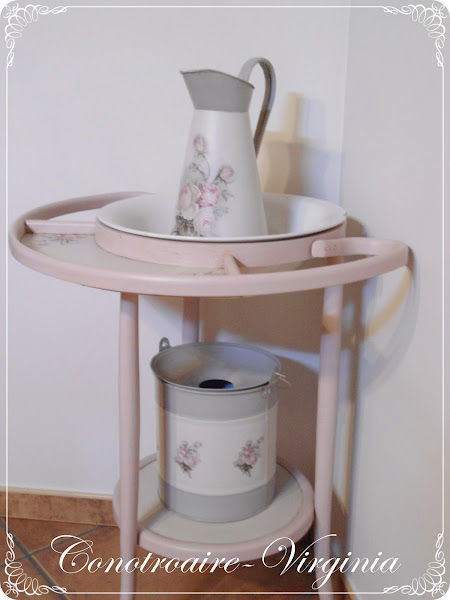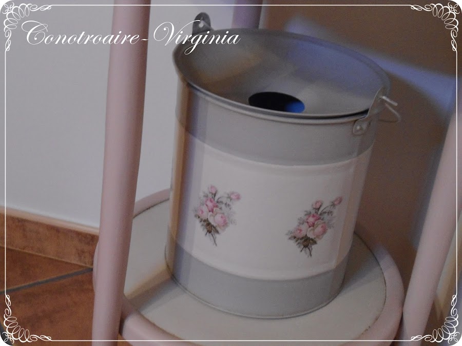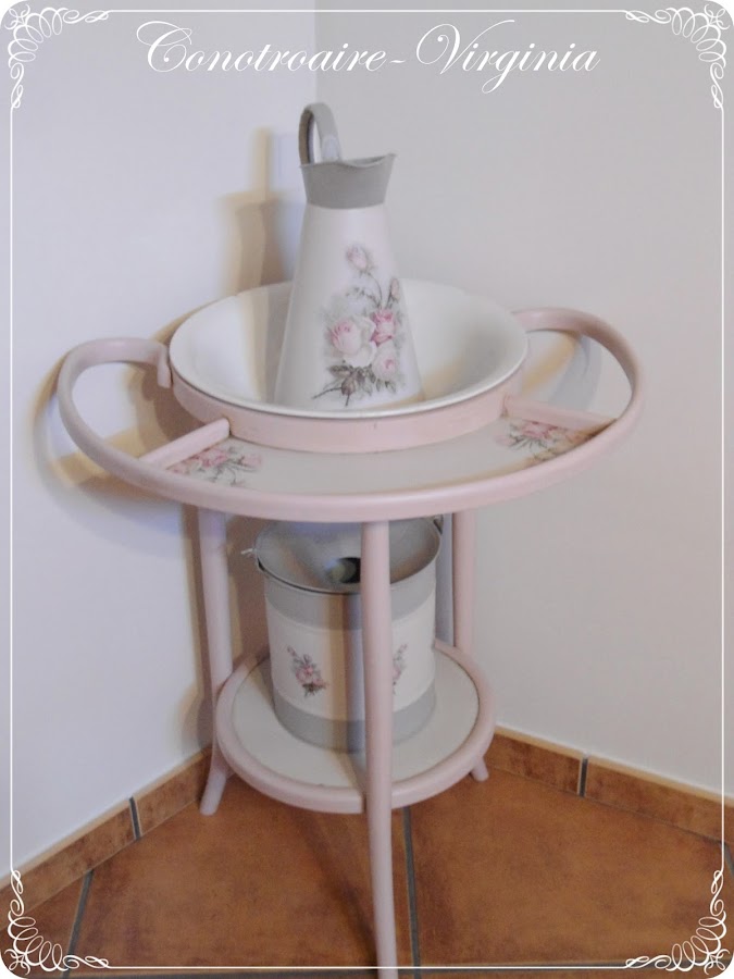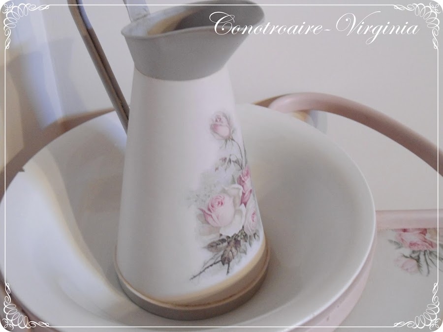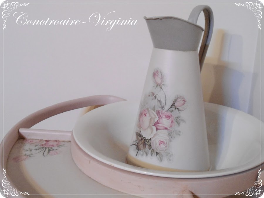 Las flores de la jarra, el cubo y la bandeja superior son decoupage de varias servilletas que van coordinadas.
