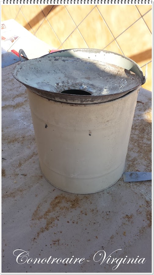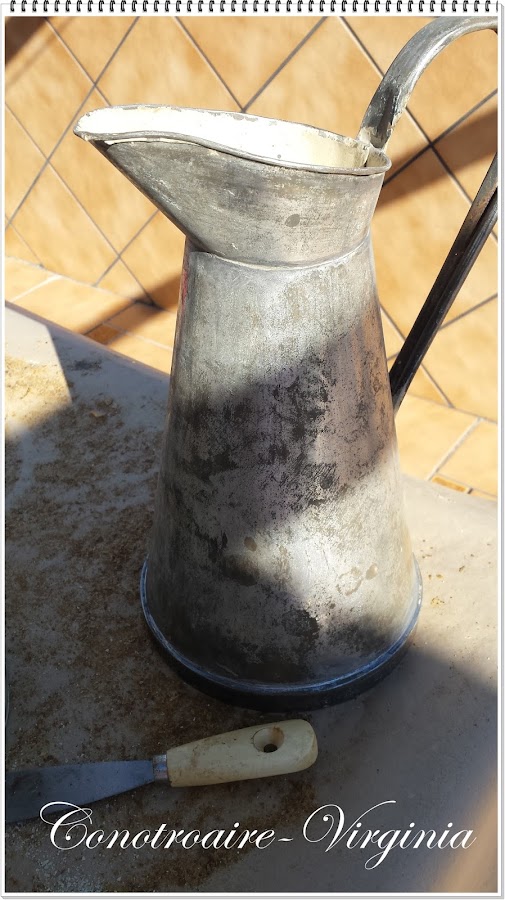Luego le toco el turno a las piezas metálicas, la jarra y el cubo. Estaban pintadas con una pintura tipo a la cal o algo así, muy desconchada y amarillenta. Al igual que a la madera, le fui retirando toda la pintura con una espátula...
