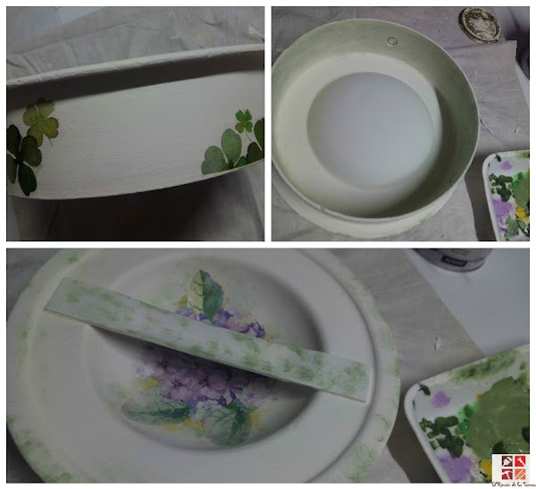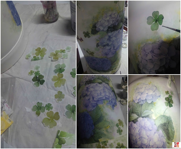 7- Y con la tapa lo mismo, decoupage con la hortensia y con las hojas, toques a esponja en verdes en el interior y exterior de la tapa y los mismos tonos añiles, lilas y amarillos integrando la flor.