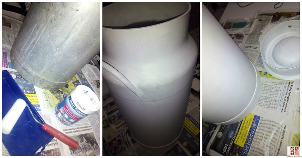 El interior de la lechera no lo había tocado, en un principio la iba a dejar con su color plateado pero no me acababa de convencer así es que decidí darle una mano de imprimación y otra de la misma pintura blanco antiguo que tiene el exterior.