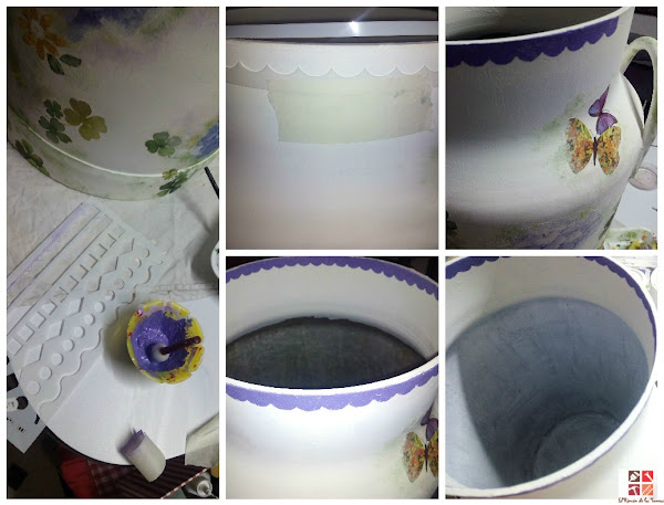 8- El siguiente paso fue hacerle un estarcido por el borde de la lechera, tanto en el interior como el exterior.