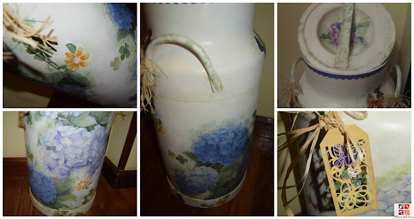 3- Empezamos con el decoupage del papel de arroz que elegí, me gustaron mucho los tonos de estas flores para la lechera, me parecía que podía quedar muy fina...pero ...sigamos.
