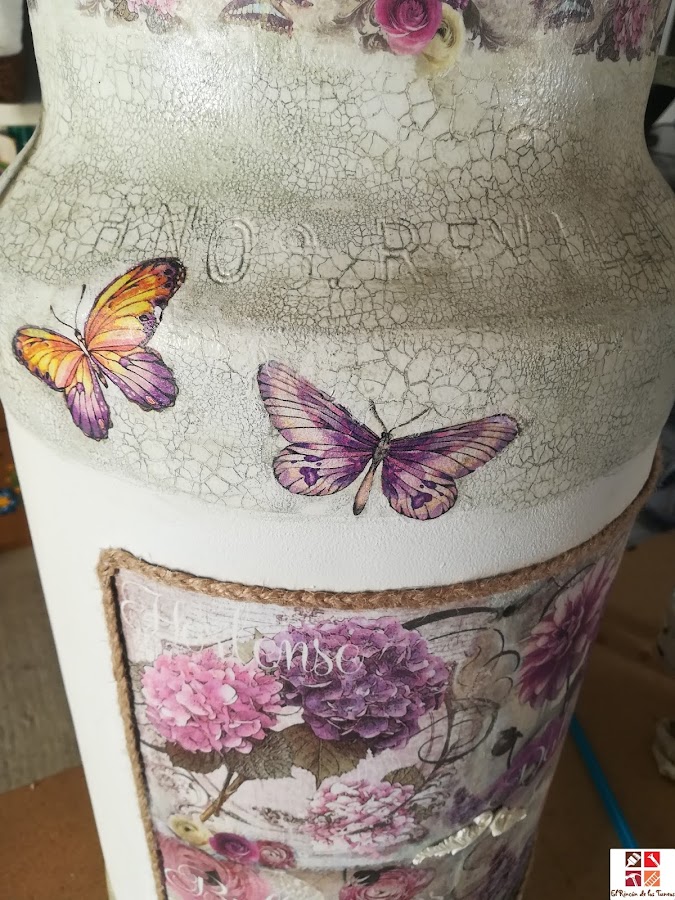 Ana, una amiga, me había comentado que tenía una lechera grande en casa pero quería que yo se la pintase con motivos shabby chic: flores, tonos suaves pero sobre todo lo que más la gusta son las hortensias.