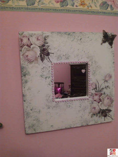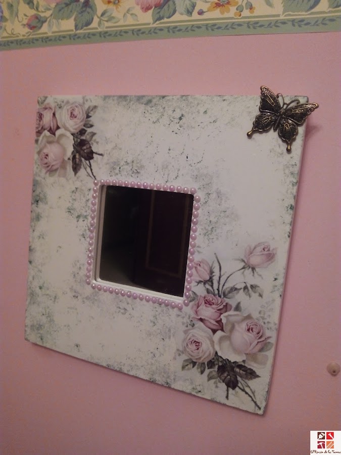 Para el espejo Malma la técnica es la misma, pegar con cola decoupage, integrar la servilleta con pequeños toques con una esponja en tonos grises y verdes y adornado con perlas rosas y una mariposa metálica adhesivas.