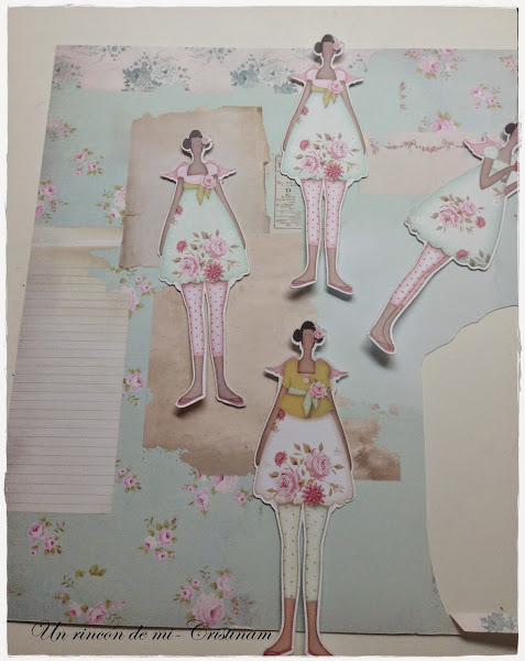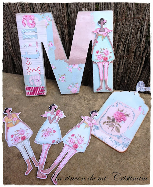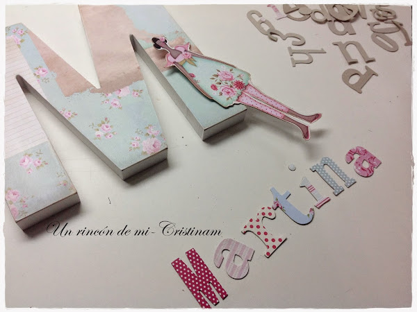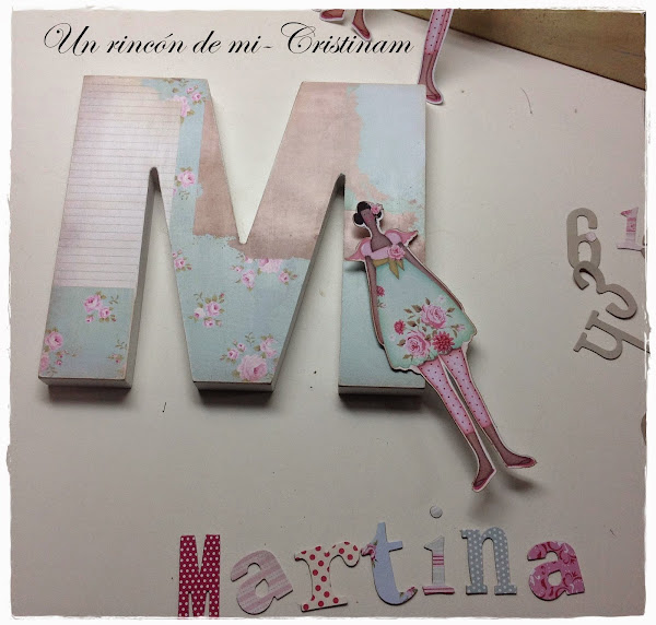 El nombre de Martina lo he cortado con troqueles abecedario de Tim Holtz, he usado distintos motivos de papeles Tilda que combinan muy bien entre si.