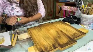Aplicaremos la goma laca Indina que ademas de sellar la madera, dara un lindo color