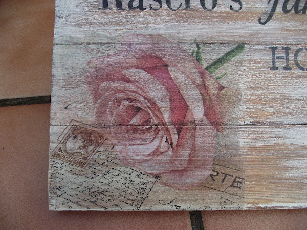 Bueno, pero siguiendo con el cartel. Para el texto tuve que combinar el estarcido con el transfer, porque no tenía plantillas para todo. Por útlimo coloqué un bote sin tapa, sujeto con alambre, para poder poner flores.