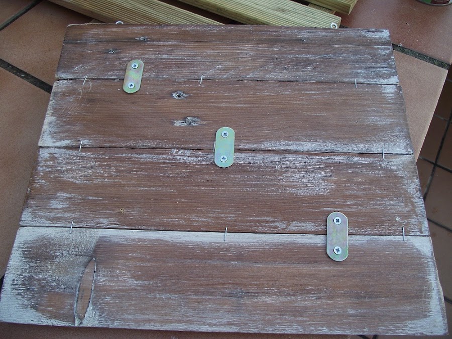 Por la parte de atrás, que me lo habéis preguntado muchas veces, uní las tablas con unas chapas de metal, para asegurar que no se separaran. Se aprecian también las grapas de tapicero que le puse para pegarlas y normalmente con ambas cosas, cola y grapas, es suficiente. Pero en el caso de las perchas o como éste, que no sabía dónde iba a estar colocado, prefiero asegurar las tablas con las chapinas.