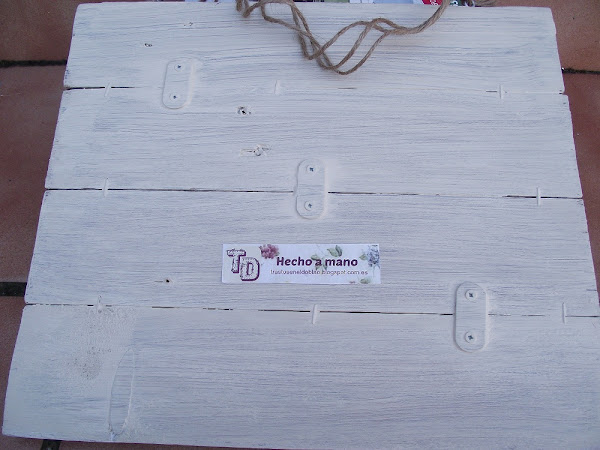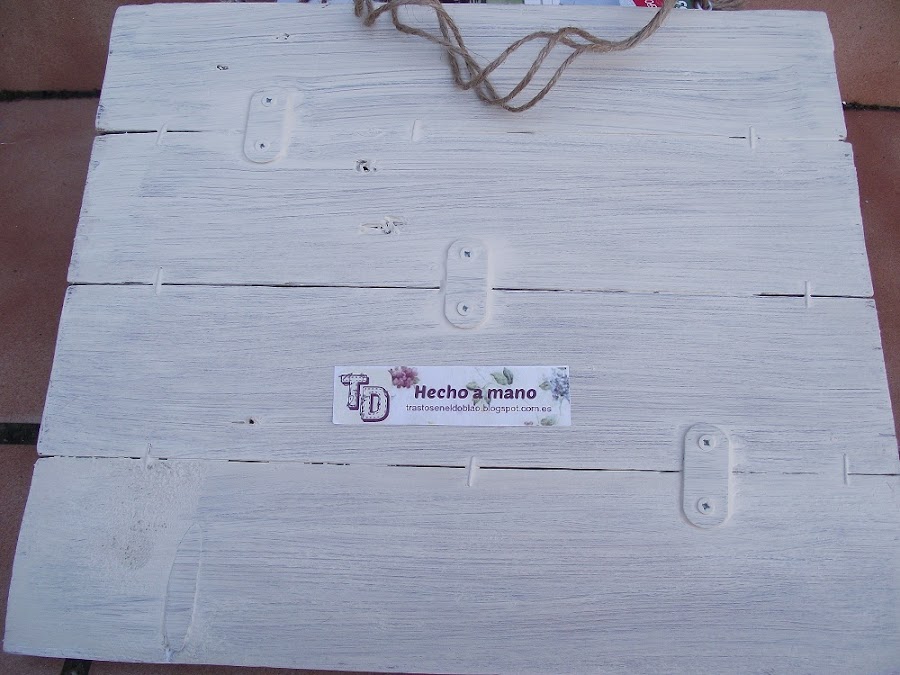 Y por último os enseño lo que se ha convertido en una ¿manía?. Mi abuela, que había sido sastra (que no modista, porque ella cosía ropas de hombre) siempre me decía que las labores se miran por el revés. Para ver lo bien hechas que están, claro. Y yo debí asimilar tan bien esa enseñanza que siempre procuro quedar los trabajos curiositos por la parte de atrás jaja. En este caso una mano de pintura de tiza, que agarra muy bien, es suficiente; y aunque se ven las chapas y las grapas... parece que unificado todo por el color queda mejor terminado.