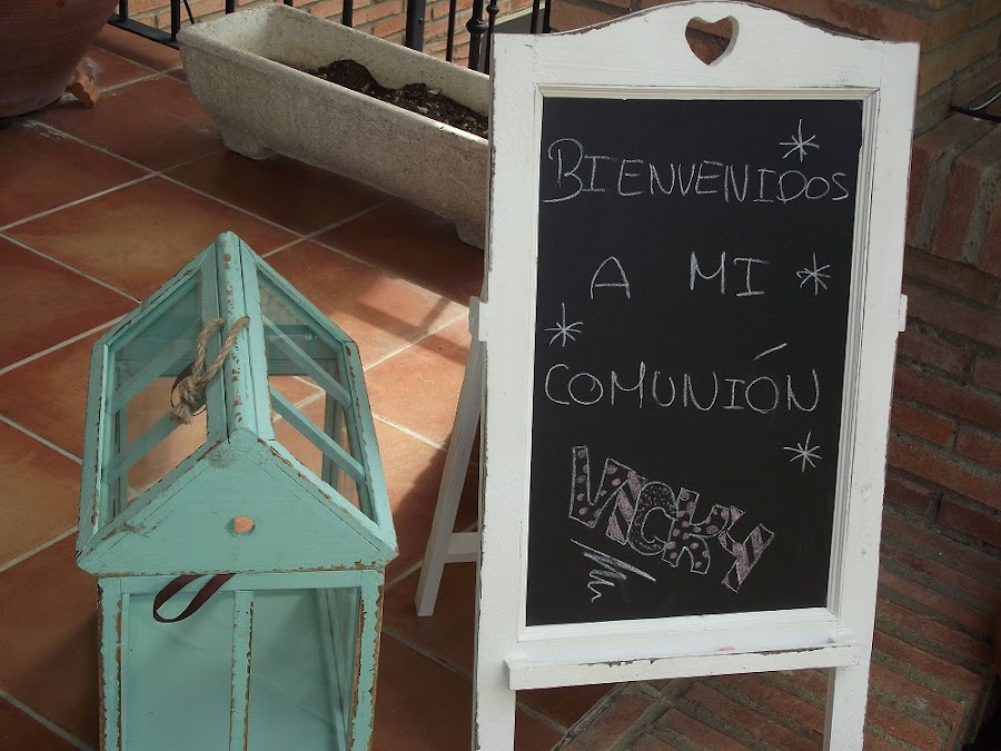 ¿Os acordáis de la cajita de bailarina que hice para mi sobrina Victoria? Pues la bailarina, que es la benjamina de la familia, ha hecho la primera comunión y su mamá, que es muuuuy valiente, lo ha querido celebrar en casa, porque viven en el campo. Así es que para contribuir a la decoración del jardín hice este letrero que os enseño, con un mini texto en inglés y el primer apellido de la familia (lo de poner sólo un apellido es una costumbre muy anglosajona, por eso estuve pensando si poner los dos apellidos, pero como me parecía muy antiestético y era para una fiesta...así lo dejé ).