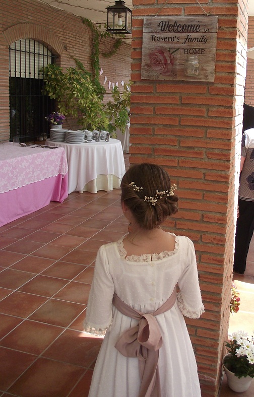 Os pongo una foto del lugar donde se colocó. La celebración fue preciosa, el jardín estaba muy bonito y no se había descuidado ningún detalle: la mesa donde comerían los niños, el rincón con los regalitos, la mes de las chuches... La niña lo disfrutó mucho y todos los que la acompañábamos también. Para ser la última comunión de la familia nos va a quedar muy buen recuerdo.