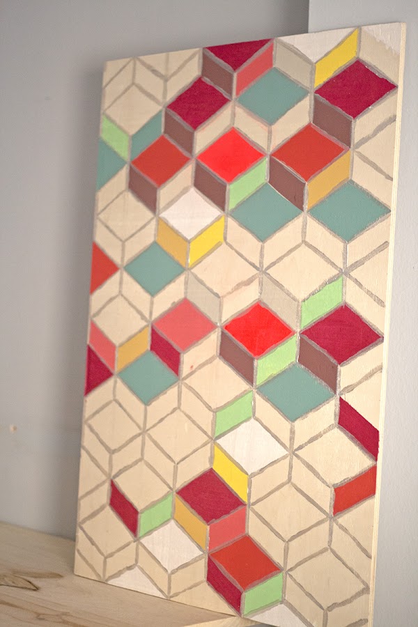 2. Cuadro de efecto óptico en contrachapado: Me encanta este cuadro. Sigue ahí, junto al mueble de la tele y cuando lo miro pienso que, a pesar de sus muchos colores, no me cansa. Ha sido uno de los DIY más divertidos que he podido hacer durante este año. Además, gracias a animarme con este cuadro he empezado mis primeras clases de pintura . ¿Quién me diría a mi que empezaría a pintar? Nunca lo hubiera imaginado, pero aquí estoy, una cosa ha llevado a la otra y ya sabes lo que dicen: "el saber no ocupa lugar". ¿Te animas tú empezando por algo tan sencillito?