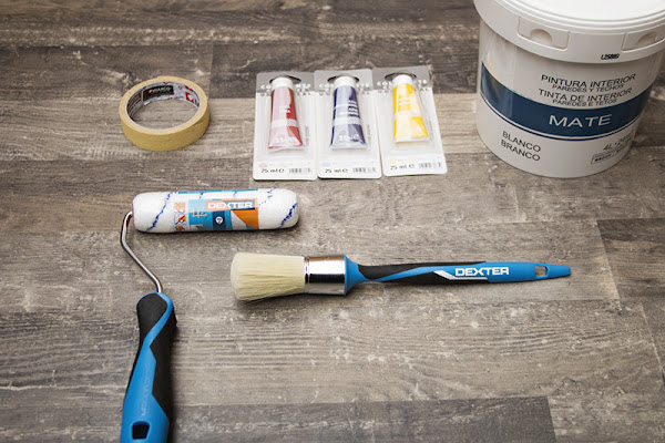 Como quería meter varios colores pensé que en vez de comprar un bote con cada color, comprar pintura blanca (la más barata! ERROR!!) y algunos tintes para conseguir el color que realmente quería sería la solución de gastar poco y conseguir un mural muy original.