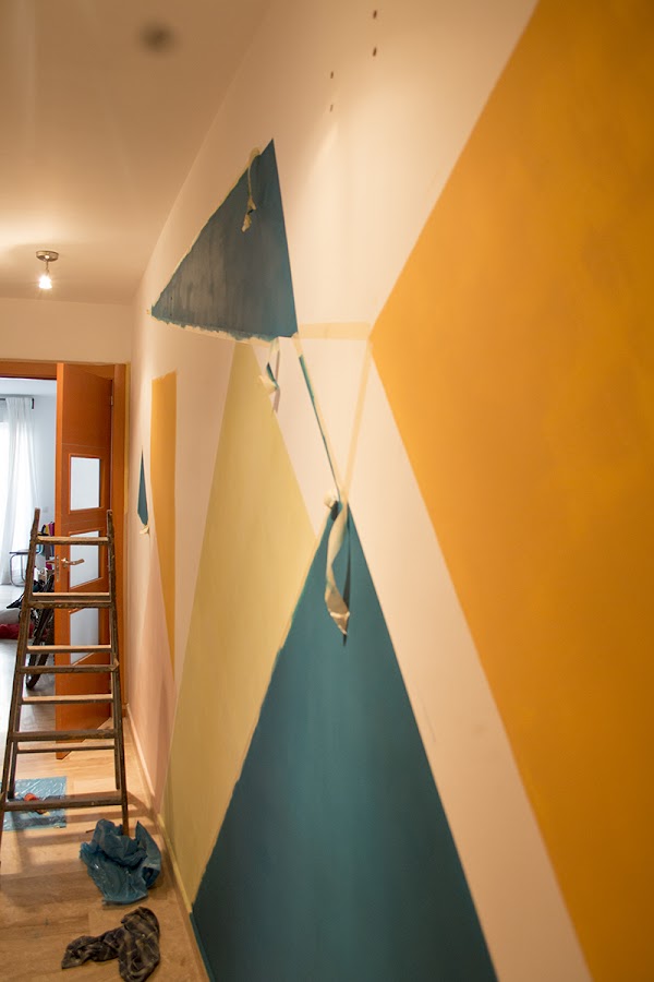 Los colores los tenía aproximadamente claros (sólo aproximadamente), pero claro, al mezclar con pintura blanca unos tintes el color que obtienes es pastel. Nada que ver con los colores vibrantes y llamativos que quería conseguir. Quería que al entrar en casa o que al hacer una foto desde el salón el pasillo se viera: "Guaaaooo!!!" y con los colores que estaba obteniendo se vería: "PPPssss". Aquí tenéis una foto de mi primer error: