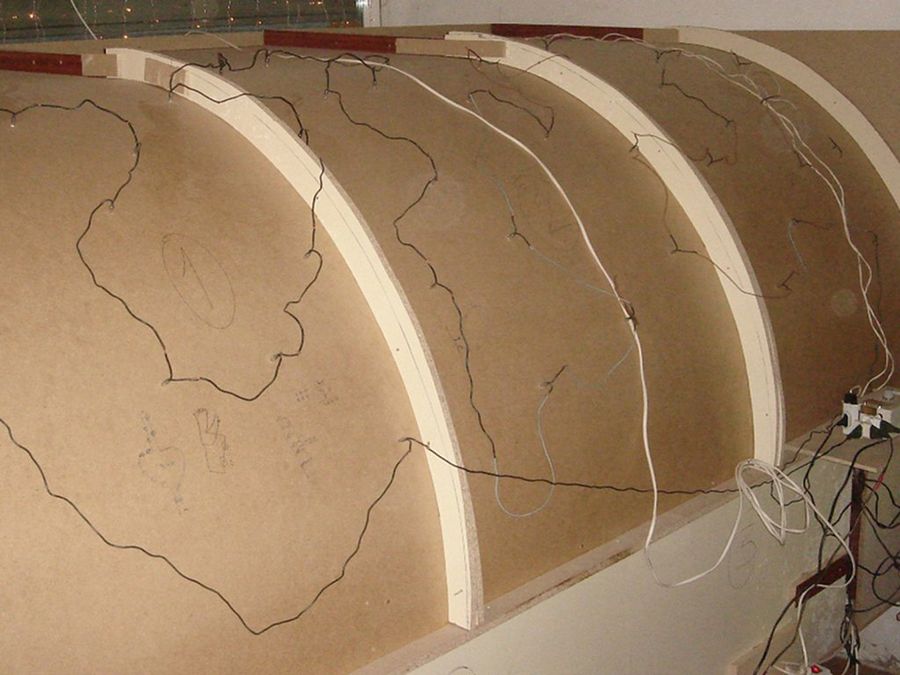 Otra variedad muy exitosa de tablero es el tablex, tan socorrido en los fondos de estanterías y armarios. Combina ligereza, resistencia y flexibilidad, por lo que tiene muy buenas prestaciones en los montajes del Belén. Aquí vemos la ?concha? montada para el firmamento del Belén de una carpintería.