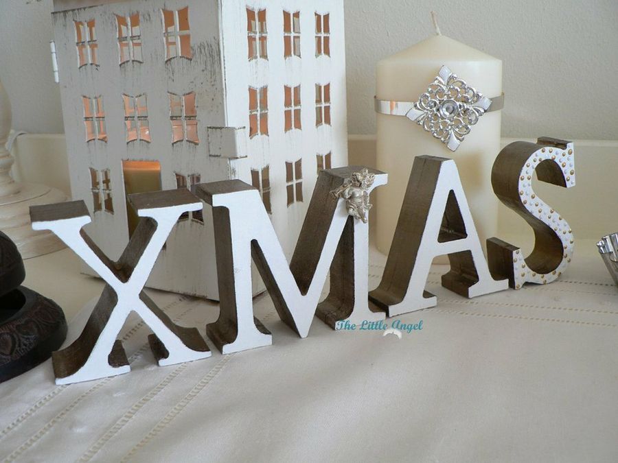 Nueva aplicación del tablero DM, los rótulos navideños tan de moda. Nuestra amiga Marian-S escogió unas letras de agradable relieve por sus 3 cm de grosor. Una vez comprado el letrero, lo embelleció pintando el frente y el dorso en blanco y los laterales en oro viejo, con leve decapado final que le otorga una cálida apariencia.
