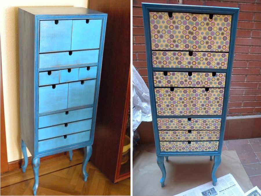 Cerramos la maravillosa galería de tuneos con este precioso montaje de Casero70. Nuestra amiga recurrió a las populares cajoneras 'Fira' de Ikea para su logrado diseño, que tiene doble vocación decorativa ya que la trasera de los cajones lleva un decoupage alegre y multicolor.